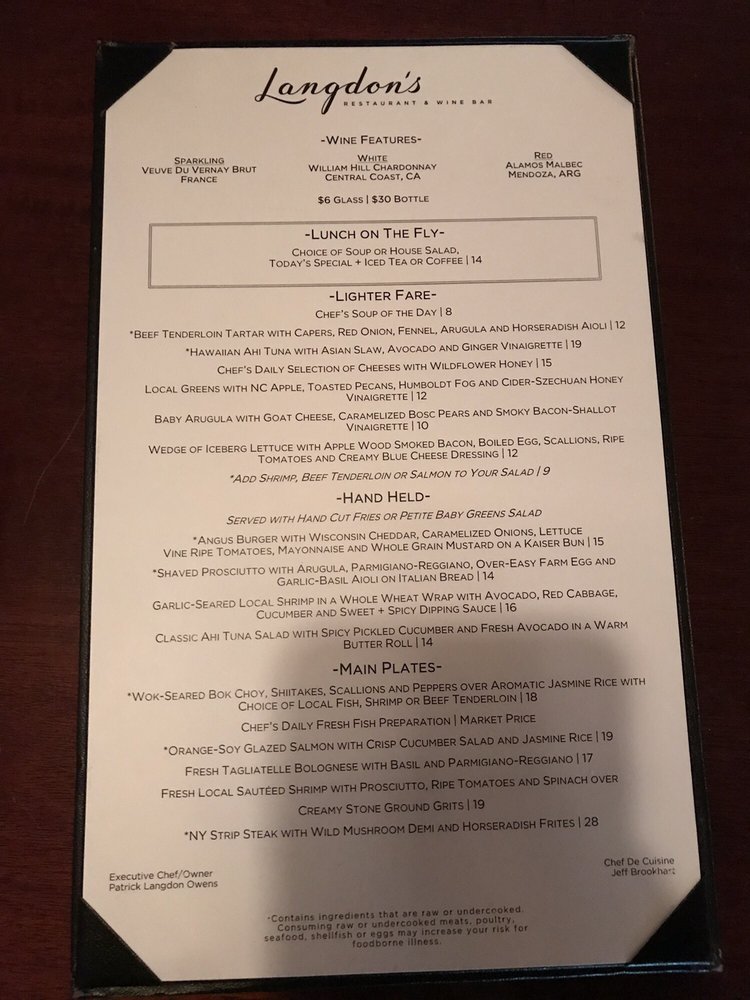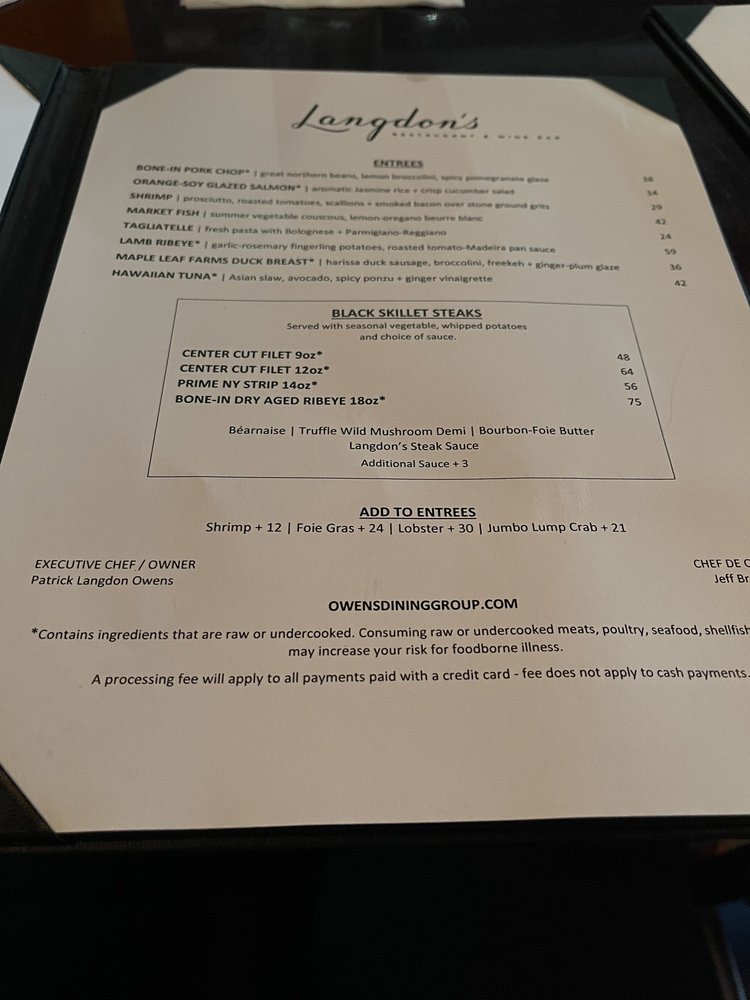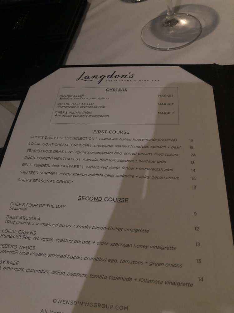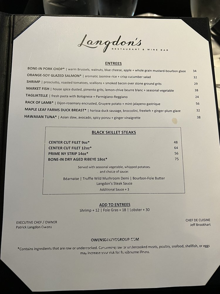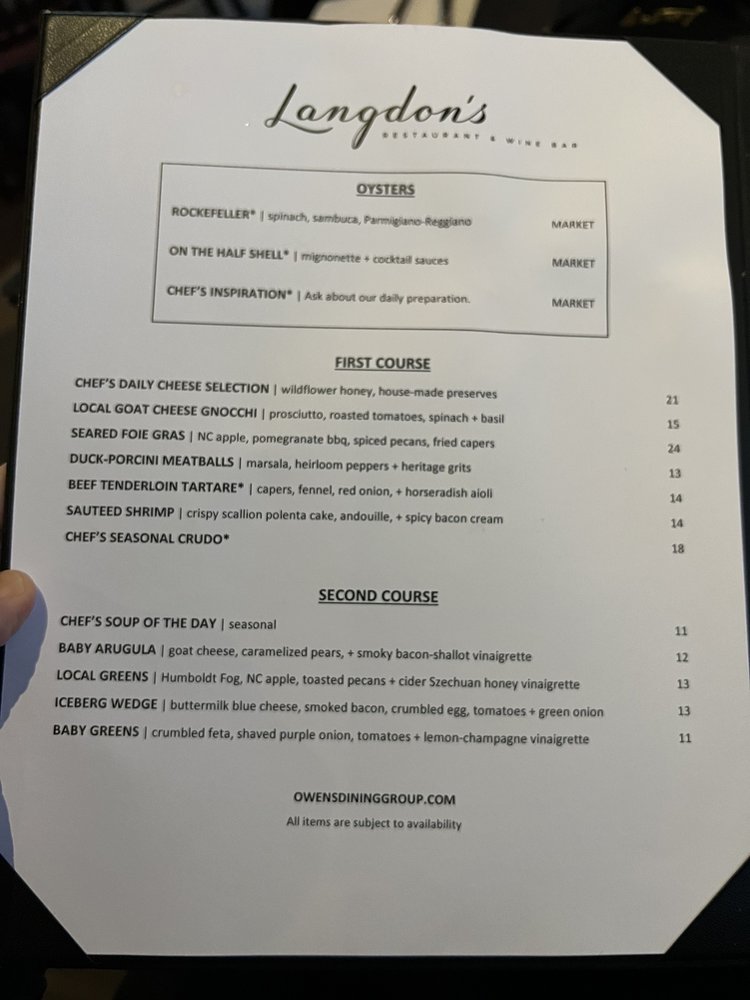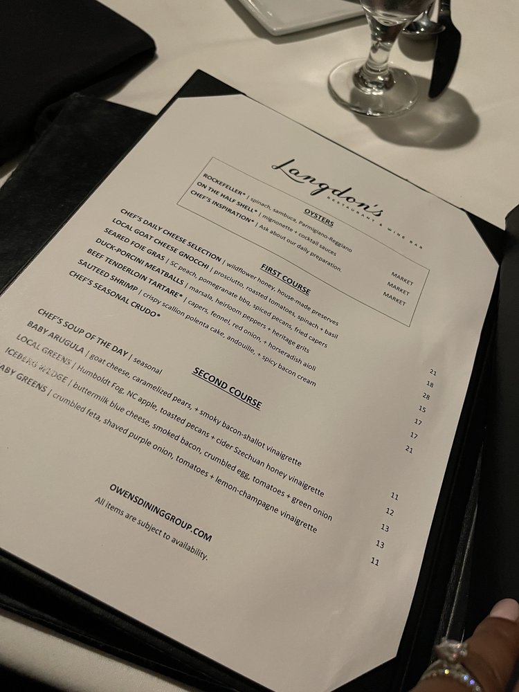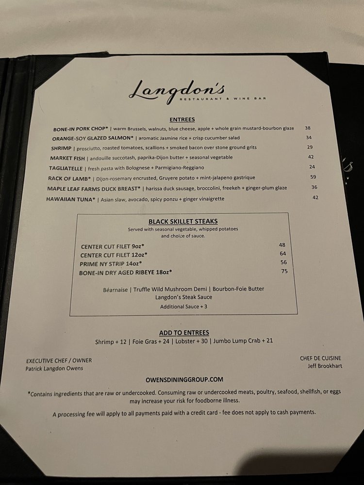 Located in Mt Pleasant, SC, Langdon's is a New American restaurant that exudes class and romance. Offering a diverse menu that includes seafood and vegetarian options, Langdon's is perfect for a group dinner or a special night out. The restaurant provides excellent service, as seen in glowing reviews praising the professional and friendly staff. Customers rave about the delicious appetizers, such as juicy duck meatballs and spicy Tagliatelle. The main dishes, like the filet and tomahawk steak, are cooked to perfection with flavorful seasoning. Langdon's ambiance is described as welcoming and buzzing with energy, making it a great spot for any occasion. With a full bar, extensive wine list, and great recommendations from knowledgeable servers, Langdon's promises a memorable dining experience worth returning to.